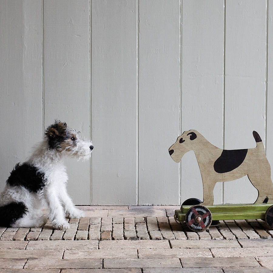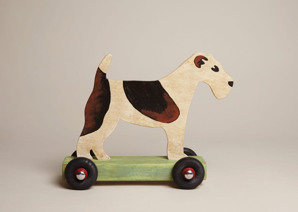 Inspired by  Fox Terrier, our Bertie on wheels is handmade in the UK. Out of stock After being featuring in ELLE Decoration our Bertie on Wheels flew off the shelves! Loved by adults and children a like, our Bertie brings a smile to everyone's face and reminds many people of a toy the used to have. Please note this is a collectors item and is not suitable for children.     made from: Wood dimensions: 44 x 34cm, with black wheels. product code: 255217 smaller versions MINIATURE BERTIE ON WHEELS £45.00Dimensions: 18 x 20cm. Please note this is not a toy and is not suitable for children..