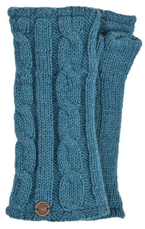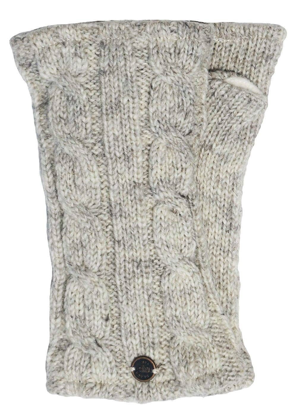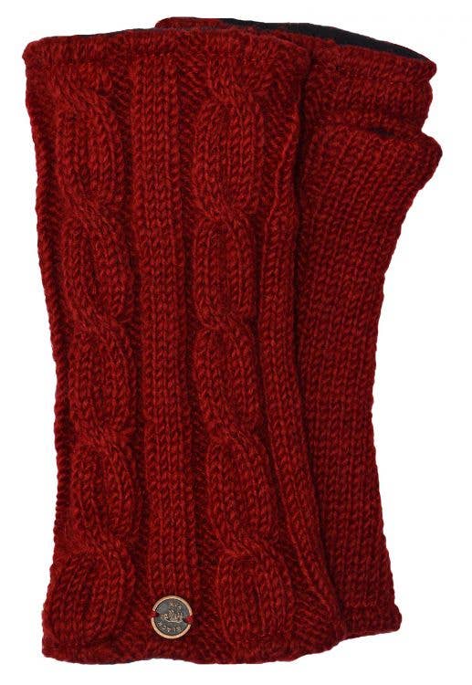 Classic cable. Wonderfully warm cable knit wristwarmers. 100% pure new wool wristwarmer with thumb. Warmth accumulates around the wrist and hand and because the wristwarmer does not need to be removed for use the warmth stays put. Perfect for texting, gardening, knitting, reading even snowballs at a push! Fully fleece lined. Machine washable - COLD wool cycle.