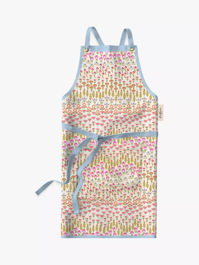 The Cath Kidston Painted Table Cotton Apron is designed with a beautiful floral print in a bursting array of colours with a light blue hem and tie. An apron is a kitchen staple to protect your clothing from stains, oil splatters and other potential hazards. The tie is adjustable and it has a pocket on the front for hanging a kitchen towel from.