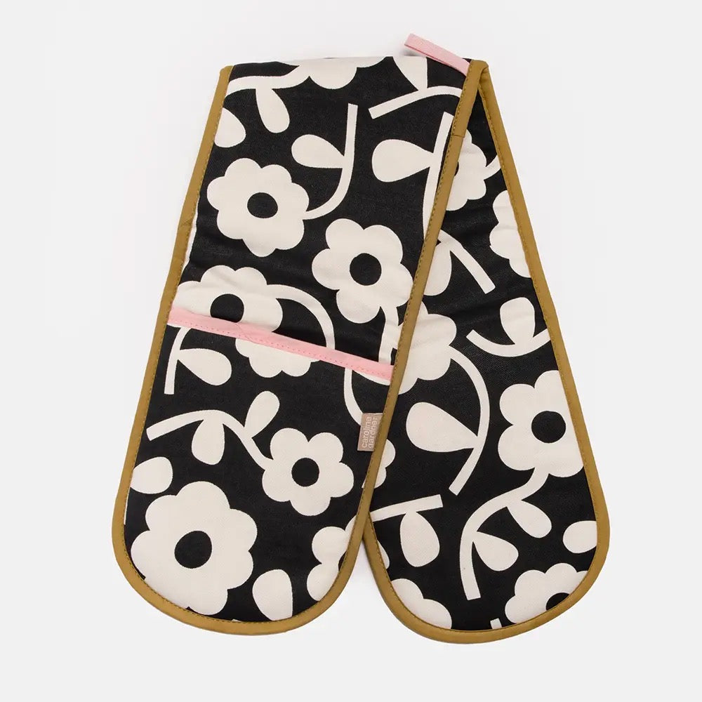 Double-layered oven glove with internal silicone lining for superior heat insulation. Durable, machine-washable cotton exterior in our stylish mono flower print. Packaged on CG branded euro hook header card.