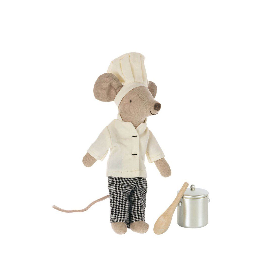 A lovely playset with a chef mouse, soup pot, and spoon. Make dinner time a play with this sweet set. Match it up with Maileg kitchen collection and miniature food . Height 9 cm.