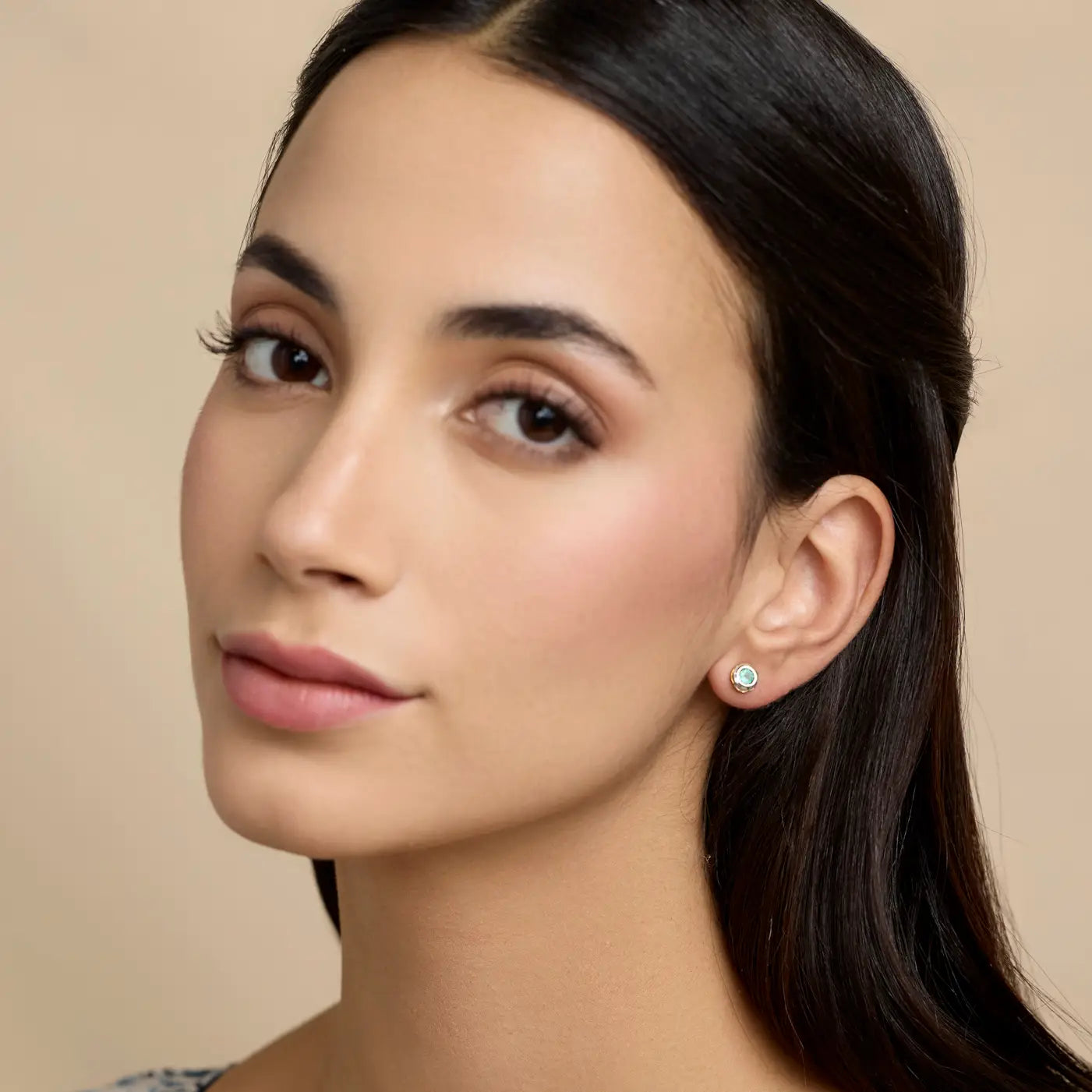 A dainty pair of green Emerald studs set in Sterling Silver and finished with 14KT Gold detailing. The studs measure 6mm wide. They come with a butterfly back. Materials: Sterling Silver, Emerald, 14KT Gold Fill Wire