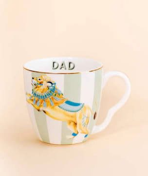 This mug is an ideal gift for birthday's, Christmas or fathers day, a great way to celebrate your lovely dad. This large mug has green stripes and a gold gilded rim for extra elegance! Our lively lion decorated in blue finery adorns the sides of the mug and there's a hidden DAD slogan inside!
