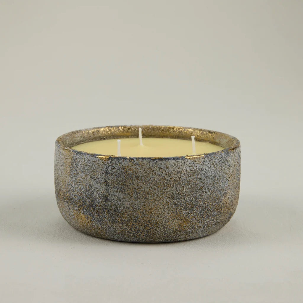 Adorned with a golden glow and a finish like winter stone, these candles glisten like frost in firelight. Let this trio of flames cast warmth and fragrance though the stillness.