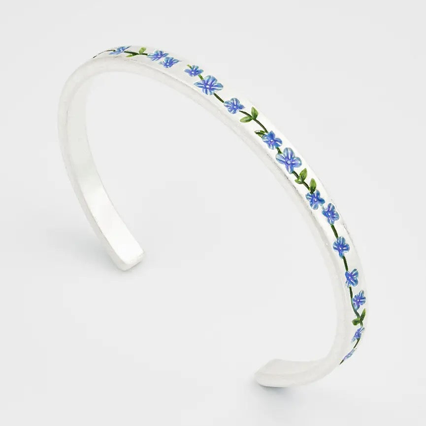 A refined addition to any jewellery collection, the Forget-Me-Not Bangle, inspired by late summer hedgerows and enduring connection, blends meaningful design with everyday wearability. Perfect for nature lovers, sentimental souls, and those drawn to meaningful jewellery. DESIGN DETAILS: Slim, open-cuff design crafted in 22ct worn sterling silver-plated brass. This timeless piece is delicately embellished with hand-painted blue enamel forget-me-not flowers, a symbol of lasting love and remembrance. COMPLETE THE SET: For a coordinated display, explore our full Forget Me Not jewellery collection available in gold and silver. MATERIALS: 22ct worn sterling silver-plated brass and zinc alloy, enamel. MEASUREMENTS: METRIC: 60mm x 50mm with 30mm opening; 4mm width IMPERIAL: 2.36" x 1.97" with 1.18" opening; 0.16" width CARE INSTRUCTIONS: Wipe clean with a soft cloth. Avoid contact with moisture, perfumes and chemicals. Store in the provided cotton pouch when not in use. PACKAGING: Presented in a branded gift box with a cotton pouch.