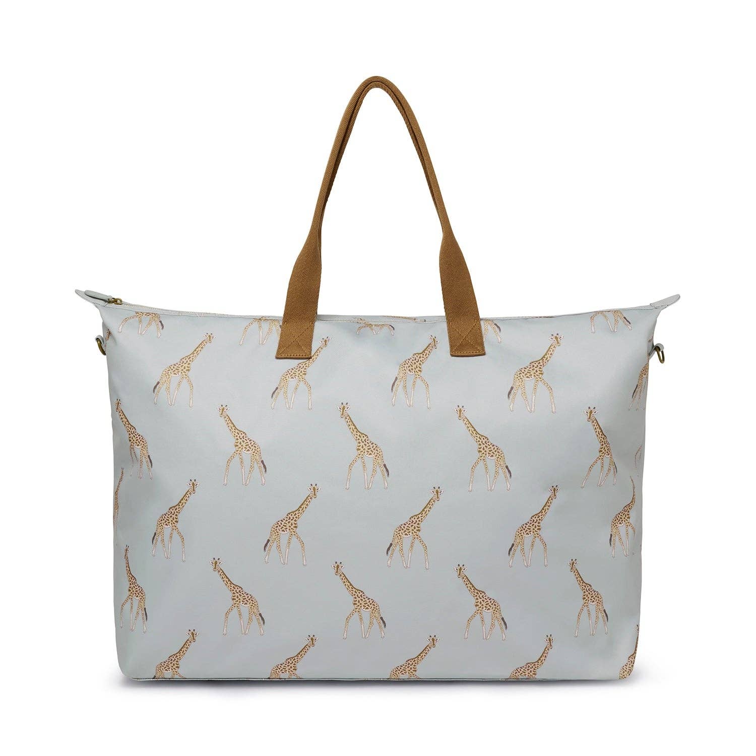 Description Travel in style with this pretty and practical weekend bag. This spacious and durable bag features Sophie’s graceful giraffe illustrations on a duck egg background. Perfectly sized for weekend getaways or day trips, it features a sturdy zip closure, robust handles, and a detachable shoulder strap for versatility. With its roomy interior and elegant look, it’s the ideal travel companion for animal lovers or anyone looking to make a stylish statement on their adventures. * H 43 x W 60 x D 24cm * Made from 100% polyester * Zip closure * Tan colour handle and lining * Detachable, adjustable strap * One zipped internal pocket * Once open internal pocket divided into two sections * Pattern may vary slightly * Coordinating items are available in the Giraffe collection Care Guide * Wipe clean only