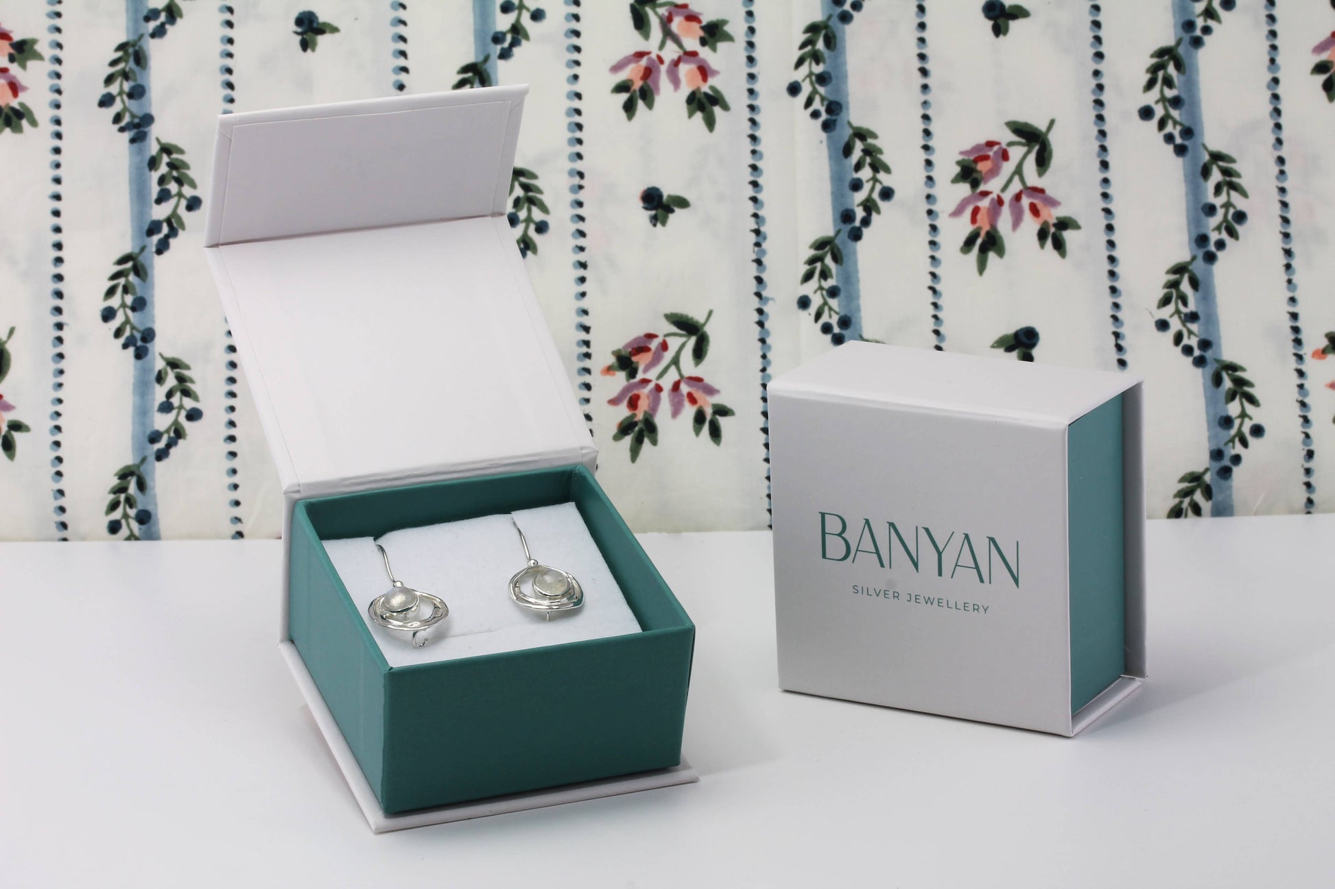 These Sterling Silver earrings feature a beautiful white Freshwater Pearl on a contemporary, flowing heart setting. The earrings have a 30mm drop and hook backs. Materials: Sterling Silver, Freshwater Pearl