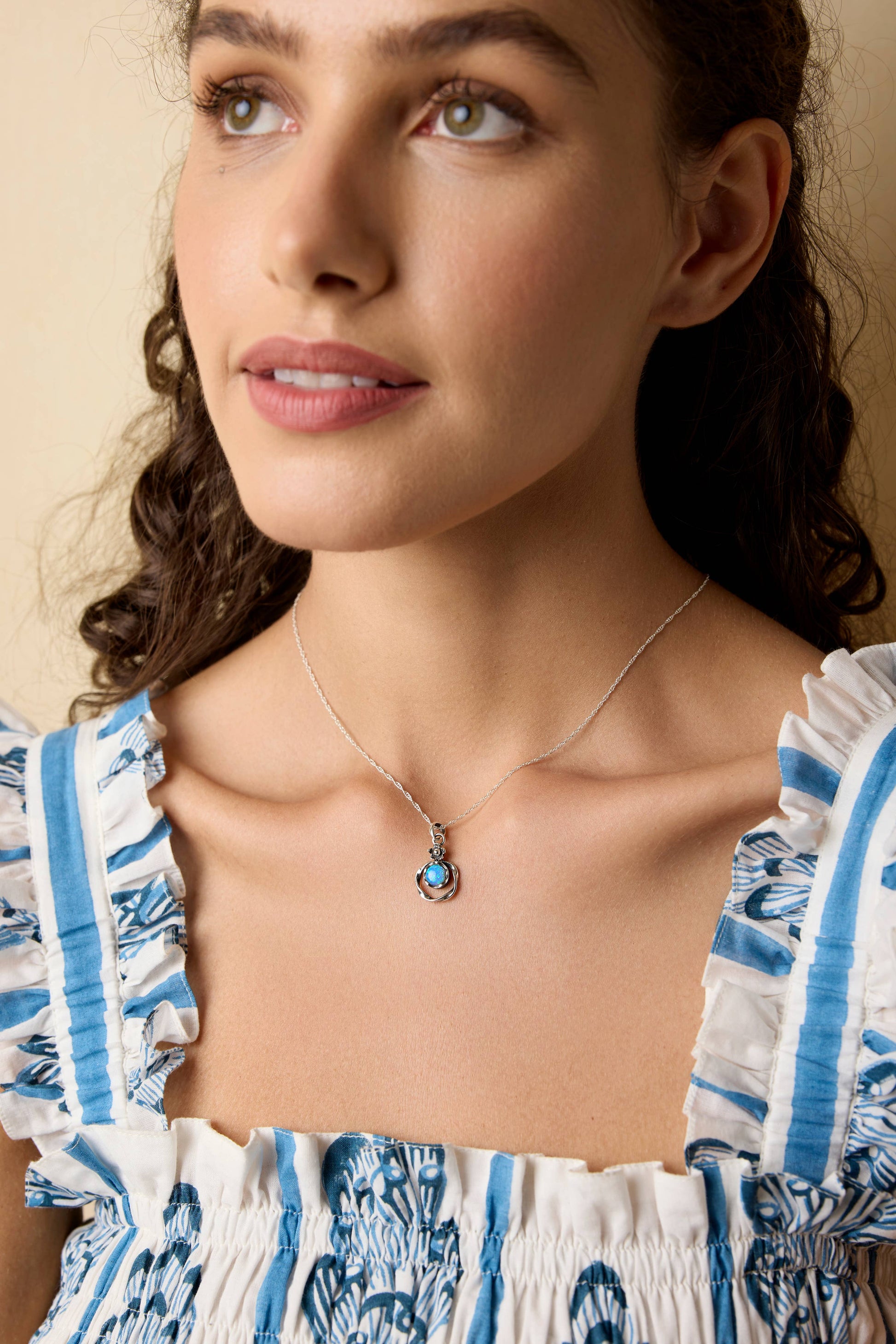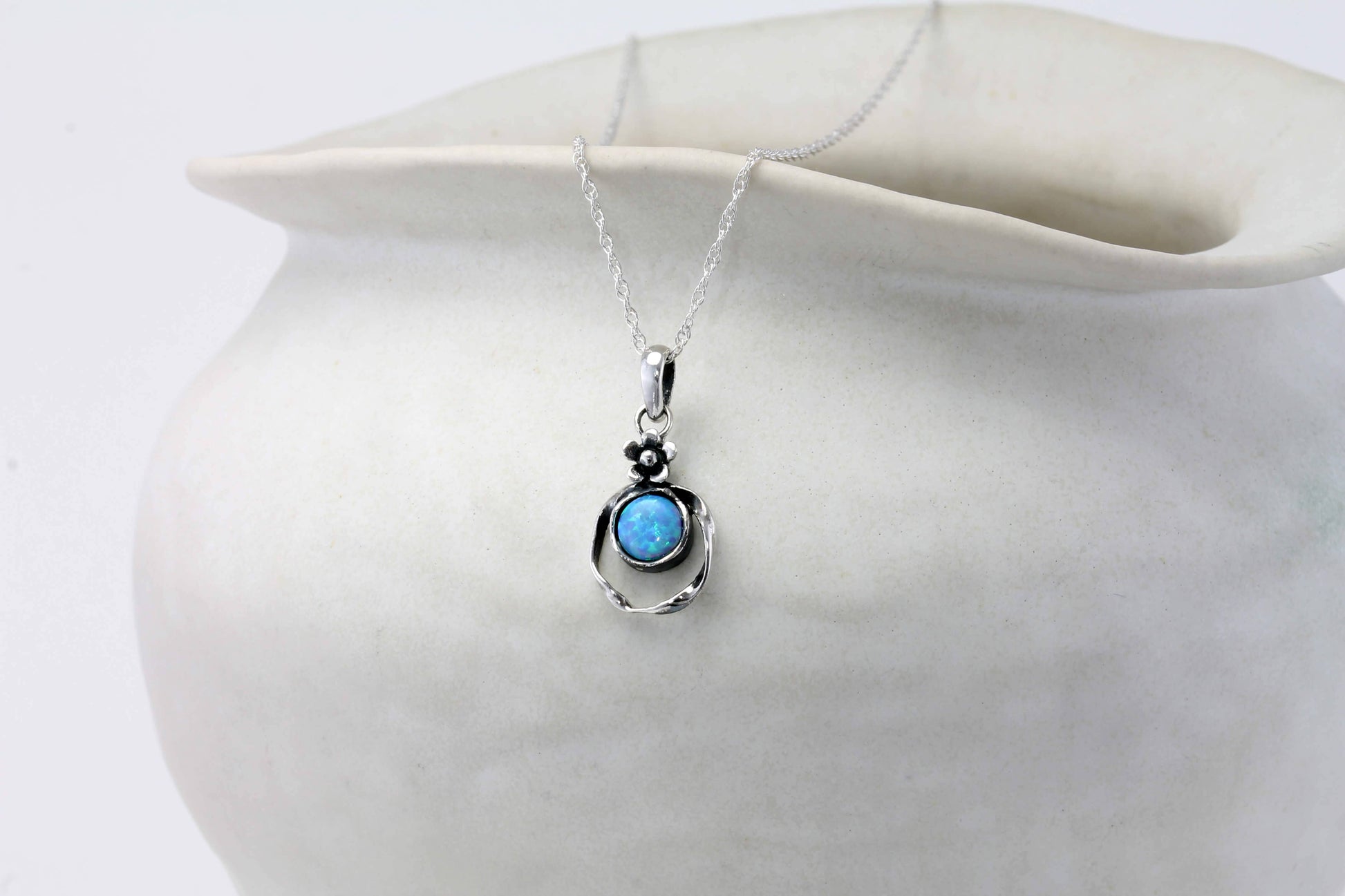 Beautiful blue Opalite set in oxidised Sterling Silver, with dainty flower. Supplied with a 16" chain. The pendant measures 12mm wide and has a drop of 23mm. Materials: Sterling Silver, Opalite
