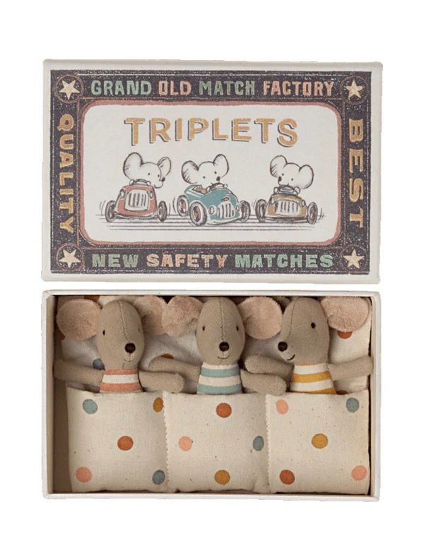 baby size mice in a single polka dot design sleeping bag with 3 individual pockets. Each mouse has a summery bright striped body: yellow, blue and coral. An adorable 'matchbox' style bed with retro print image. Each mouse is 9cm in length and accessories are available separately for these baby mice in the Maileg 'MY' section. Dimensions: