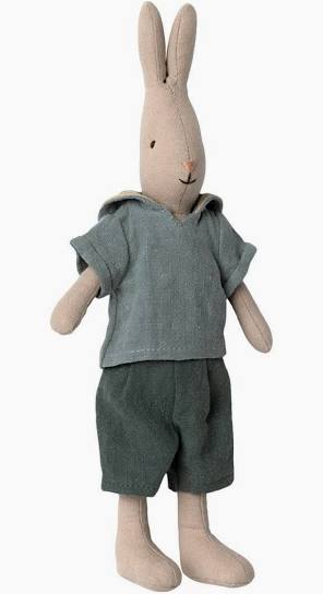 A classic Maileg rabbit in T-shirt and shorts. Made of soft natural linen and cotton fabric that gives a lovely look and feel. Size 2 rabbits fit into all the Mini size Maileg dollhouses and furniture.