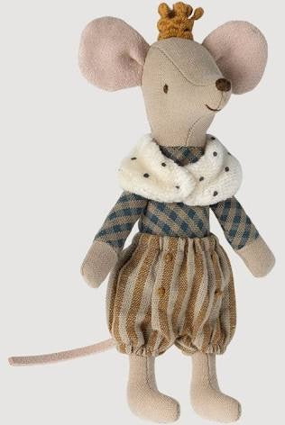 A real prince mouse in a big brother size. He is dressed in his finest clothes with beautiful details and a golden crown. He fits perfectly into the Maileg castle.