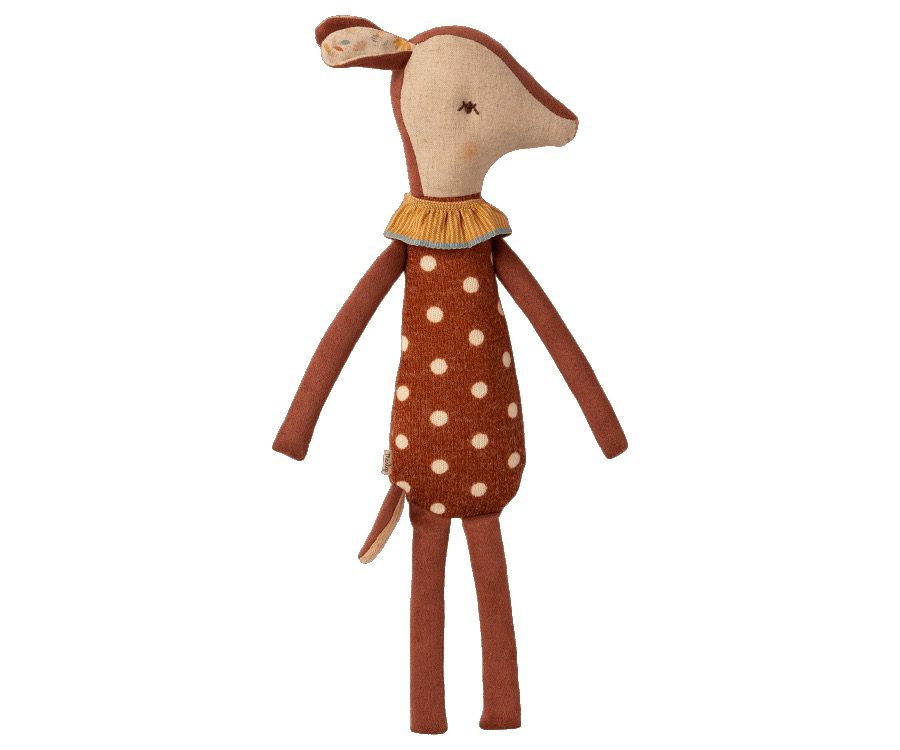 Bambi is an adorable little friend to cuddle, play and take naps with. Bambi in charming baby deer spots, comes with one eye open and one eye closed. Put him on one side and he is asleep, put him on the other side and he is awake. Height 40 cm.Sleepy/wakey bambi Item No.: 16-0932-00 Height: 40 cm Recommended age: +3 Year Wash: 30°C Material: Polyester/Cotton/Linen Filling: Polyester/Pe Pellets