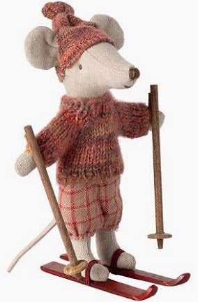 Love the hat ,   We have  got the cutest snow Mouse in town! Meet the Maileg Winter Ski Big Sister Mouse, looking adorable and oh-so-toasty in her cozy coral woollen jumper and snazzy check trousers. But that's not all—she's ready to hit the slopes with her own set of skis and poles! She's jumping with excitement, anxiously waiting for the snowflakes to start falling. Get ready to join her in snowy adventures and create unforgettable memories! Let's bring on the winter wonderland!