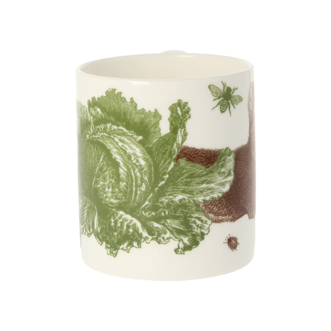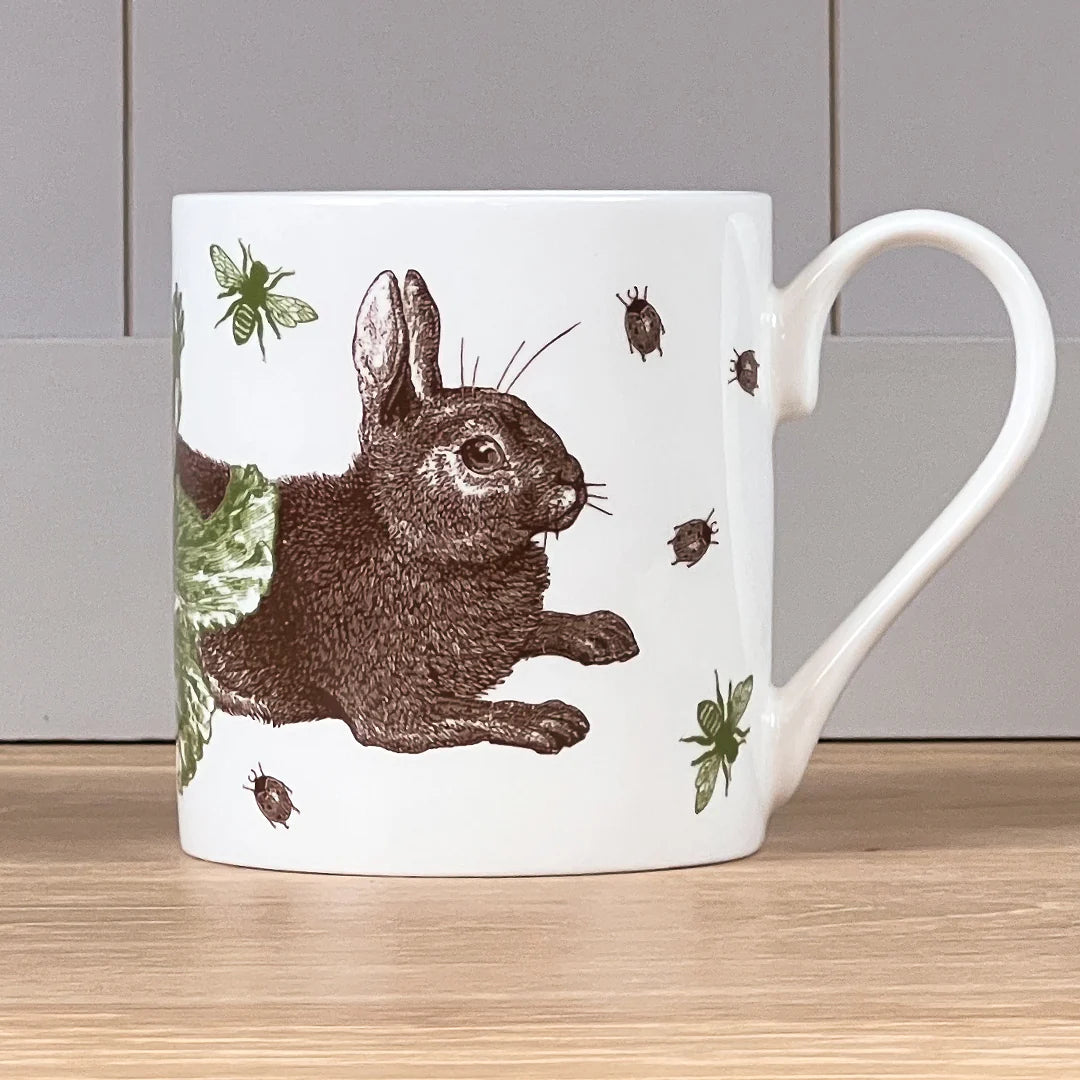 A playful brown rabbit is loose among the cabbage patch in this two-colour design. Leafy greens and chocolatey browns pop against the crisp white background.