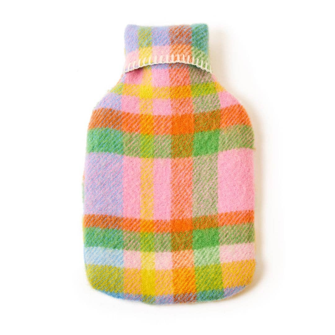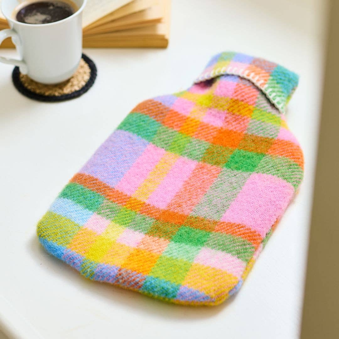 A cosy hot water bottle with a pure new wool cover in a beautiful rainbow check weave. Ease into warmth with our Hot Water Bottle featuring a beautifully woven cover made from pure new wool in a classic fishbone pattern. Crafted in the UK, this elegant yet practical accessory brings natural insulation and tactile comfort to your relaxation routine. Perfect for chilly nights, soothing aches, or simply adding a touch of heritage charm to your home. It's a must have for colder seasons - or a thoughtful gift for someone in need of extra comfort. Size: One size, bottle included.