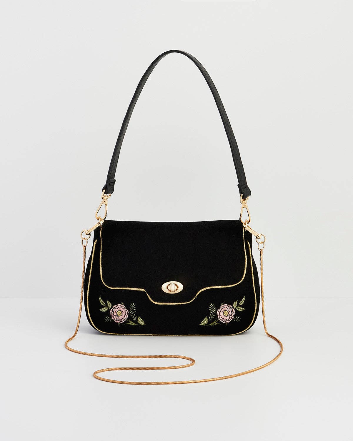 Step into the spotlight with the Black Rose Embroidered Clutch. A striking blend of timeless elegance and romantic detail. Inspired by the quiet strength and hidden beauty of the English garden, this black clutch whispers stories of grace that endures through every storm. Its delicate pink rose embroidery and shimmering gold trim add a touch of refined charm, making it the perfect companion for soirées, weddings, and unforgettable evenings. Key features: * Colour: Black * Embellishment: Embroidered pink roses, gold-tone trim * Straps: Detachable chain and shoulder strap * Interior: Zip pocket * Care: Wipe clean with a damp cloth
