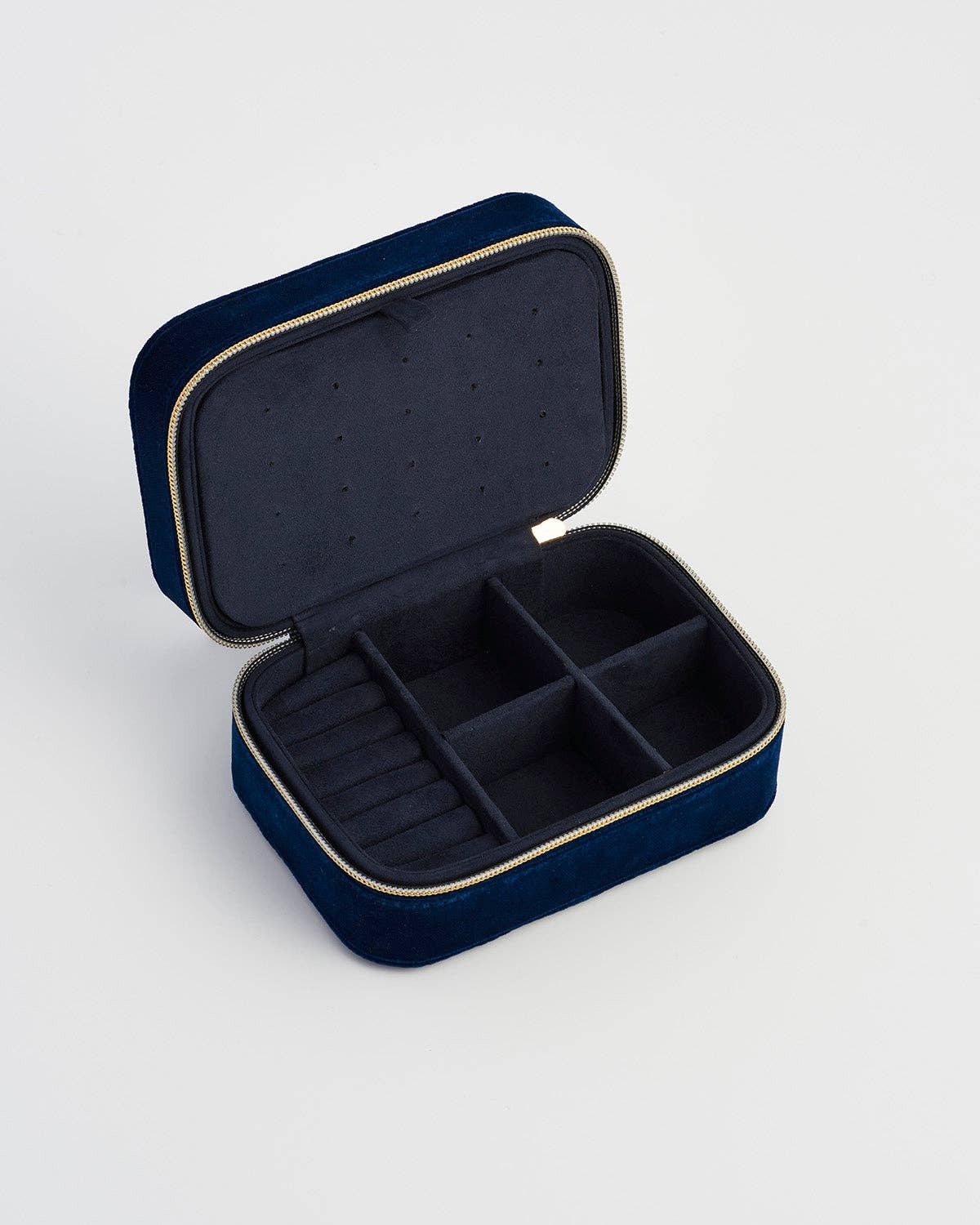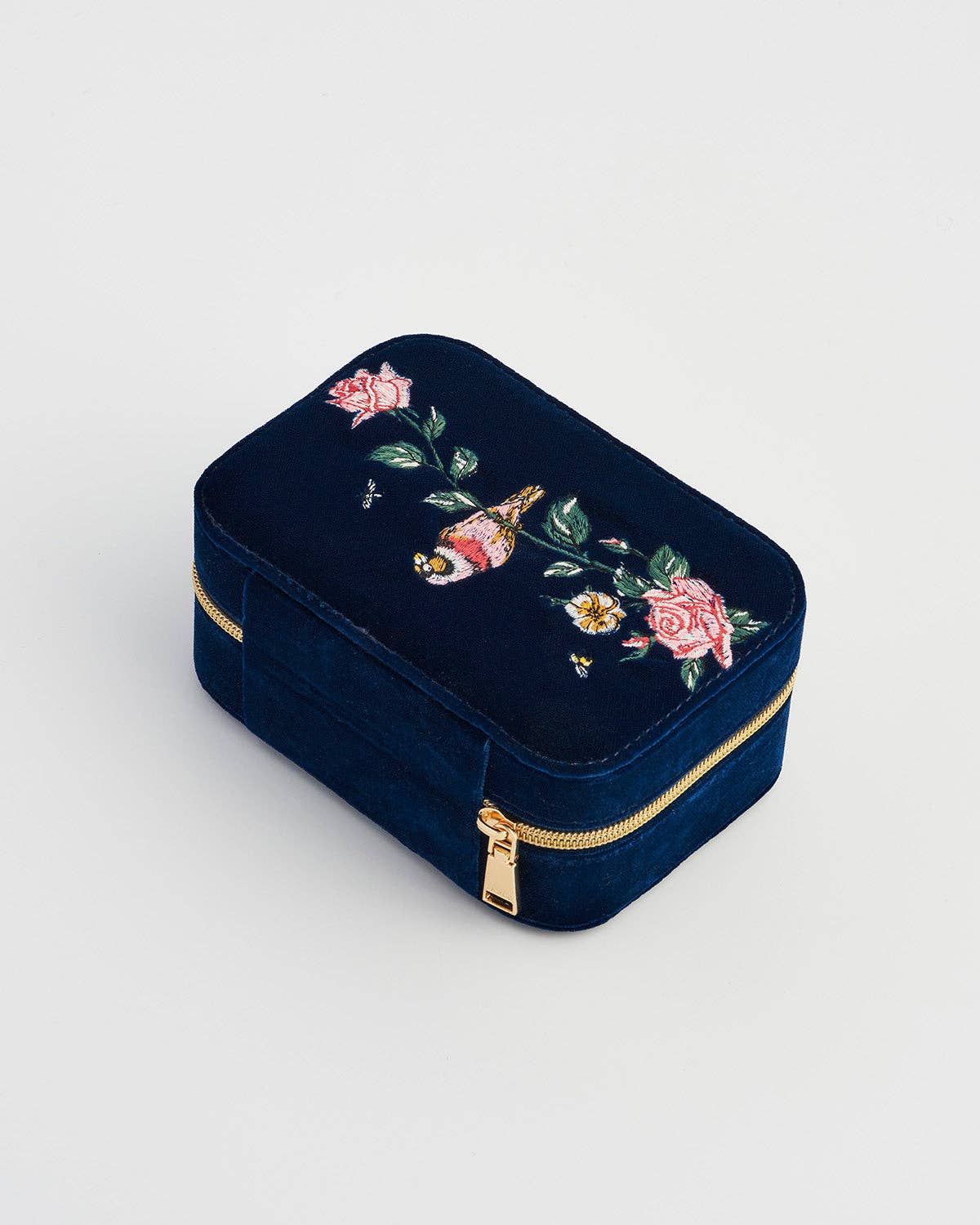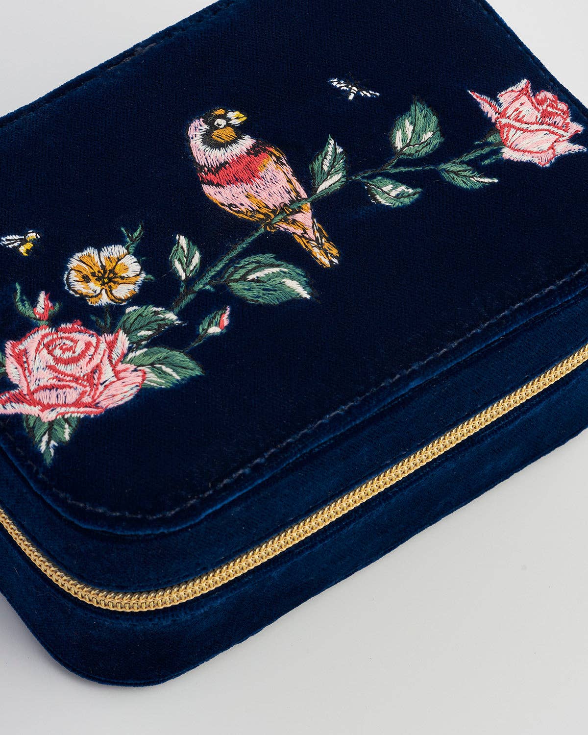 Rooted in elegance and blooming with timeless charm, the Rosy Posy Embroidered Large Jewellery Box brings a storybook beauty to your everyday rituals. Inspired by an English garden in full bloom, its midnight blue base is delicately embroidered with soft pink roses and a perched songbird - a graceful reminder that true strength lies beneath the surface. Whether gracing your dressing table or packed for travel, this jewellery box offers both function and romance. With thoughtful storage features and a rich, velvety feel, it keeps your treasures safe in poetic style. Key features: * Material: Outer 100% Polyester; Lining 100% Polyester * Dimensions: Approx. 16cm (L) x 8cm (W) x 6cm (H) * Care: Wipe clean with a damp cloth * Compartments: 7 ring slots, 4 compartments, 20 earring holders, 5 necklace holders * Packaging: Presented in protective wrap for safe keeping or gifting