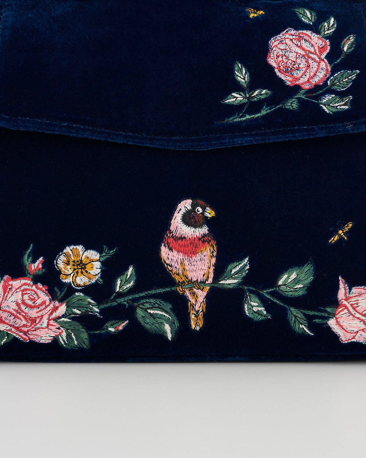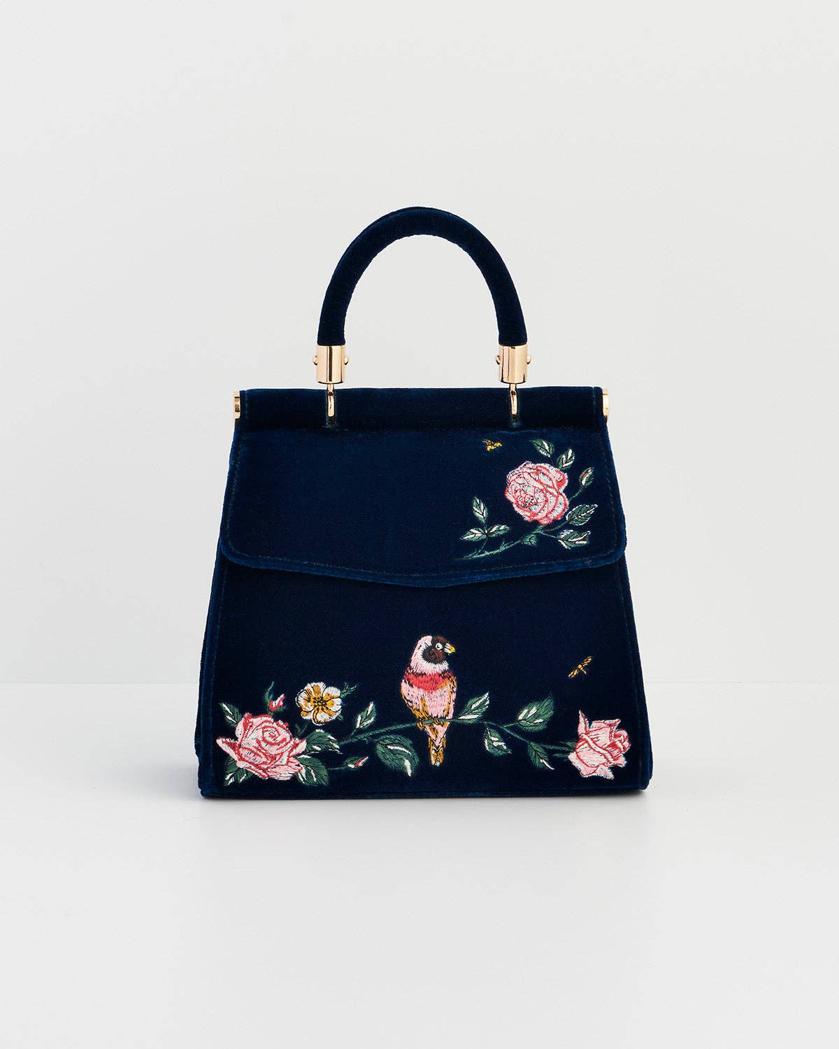 Graceful as a garden after rain, the Rosy Posy Mini Top Handle Bag brings the poetry of wild blooms to your everyday moments. Inspired by the tale of the enduring rose that stands tall through the storm, this embroidered handbag is a celebration of quiet strength and natural beauty. Crafted in a rich midnight blue with delicate floral embroidery, it's a perfect blend of charm and functionality. A structured silhouette and gleaming gold-tone handle add timeless elegance, while the detachable chain strap lets you wear it crossbody or on the shoulder -making it as versatile as it is eye-catching. Key features: * Colour: Midnight Blue * Materials: Outer 90% Polyester, 10% Polyurethane; Lining 100% Polyester * Dimensions: Approx. 20cm (L) x 18cm (H) x 6cm (D) * Care: Wipe clean with a damp cloth * Straps: Chain strap converts for crossbody or shoulder wear * Interior: Internal zipped pocket for secure storage