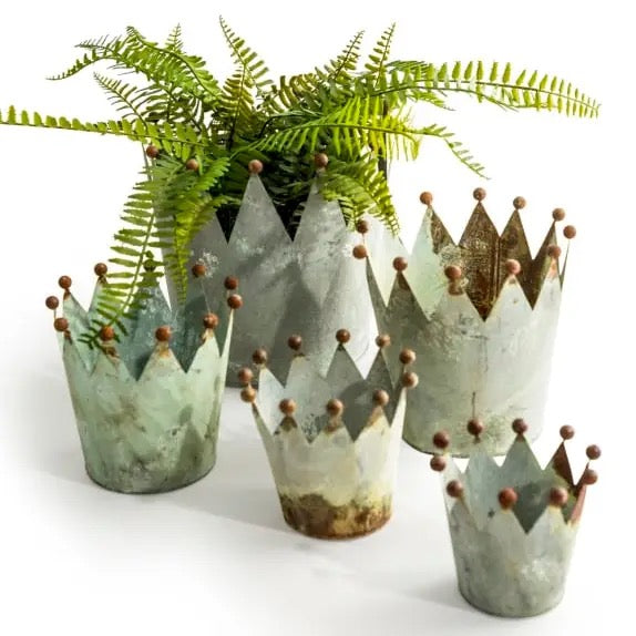 Set of 5 Oxidised-Metal Effect Crown Planters Product Dimensions: 22x23x23cm / 18x18x18cm / 15x15x15cm / 12x13x13cm / 8x9x9cm