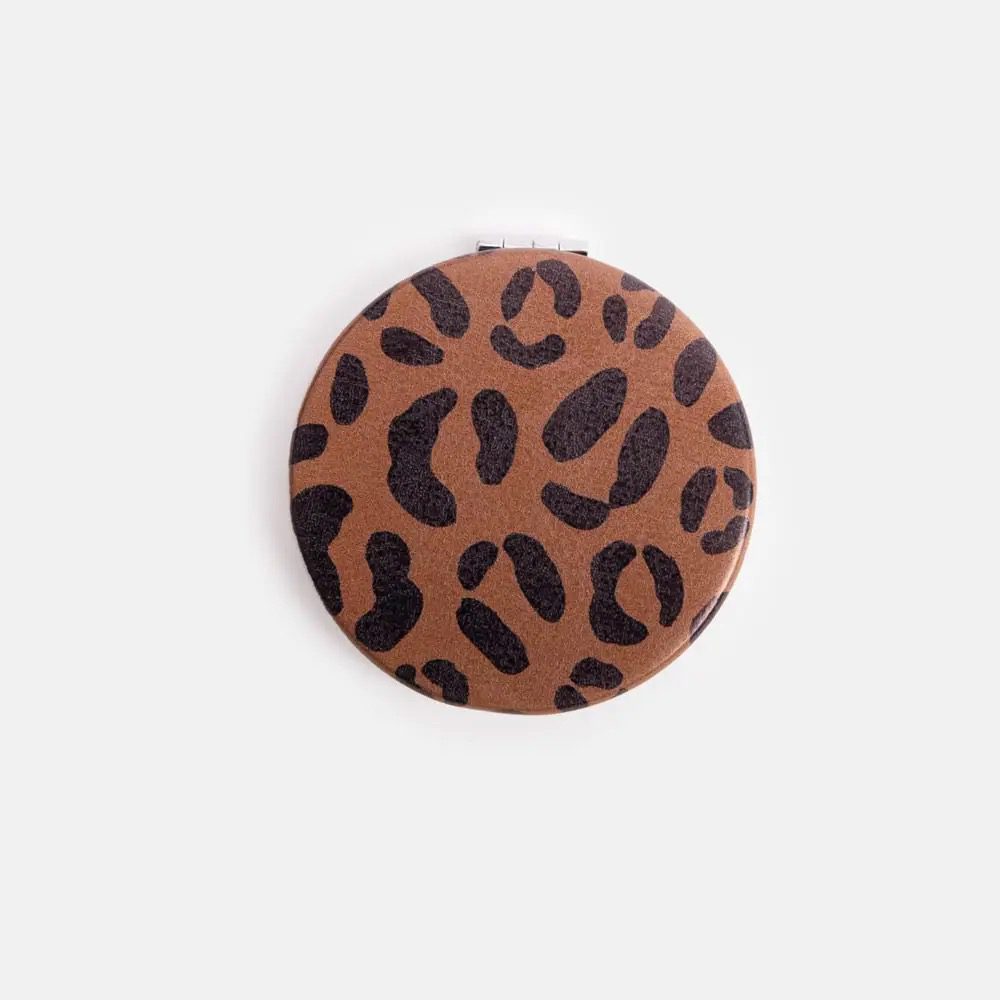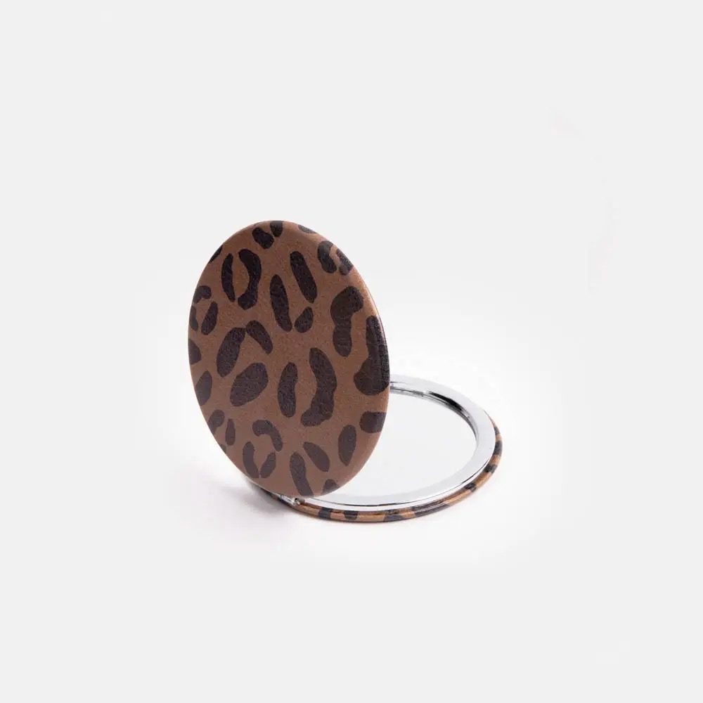 Round pocket mirror in branded card box packaging. The hinged magnetic closure keeps it secure and opens up to reveal two mirrors - one with magnification, great for all those on-the-go makeup touch-ups.