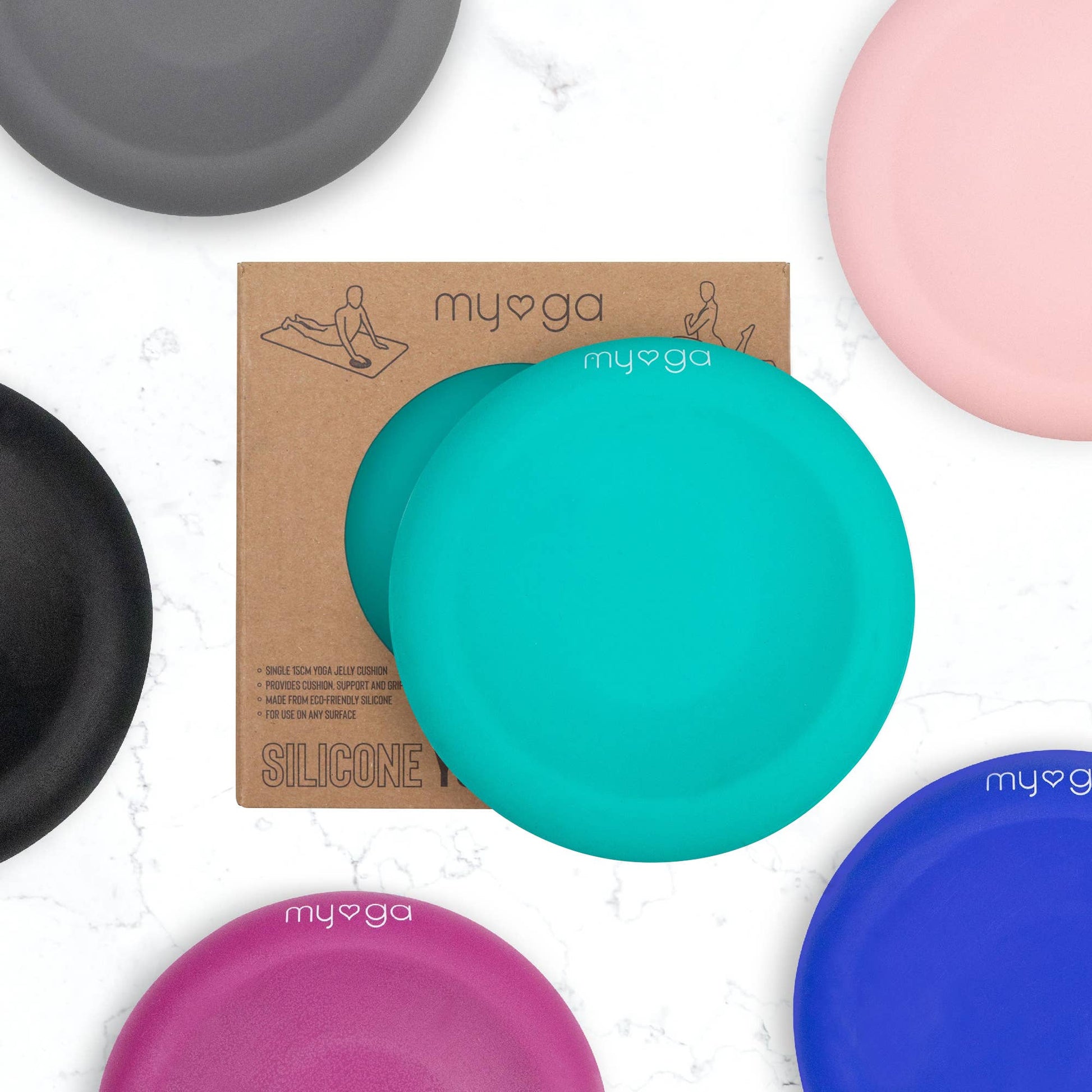 Available in 6 different colours, the yoga support pads are also known as yoga jellies. These silicone jellies are a fantastic prop for yogis with ailments including arthritis, carpal tunnel syndrome, wrist pain, sensitive knees, and elbows. Our jellies are also great those of you who simply need a little extra softness. Myga yoga jelly support pads can help avoid or reduce joint injuries and pain relief in the hands, wrists, elbows, knees, hips, head, and coccyx. Each single order includes one jelly pad and is cased in an eco-friendly packaging. Size: Diameter 15cm Weight:270g Material: eco-friendly Silicone Features Provides cushion, support, and grip Nonslip Easy to clean Reduce joint injuries Plastic free packaging For use on any surface Nontoxic Waterproof Sweat resistant Care: Clean the yoga pad with a damp cloth.