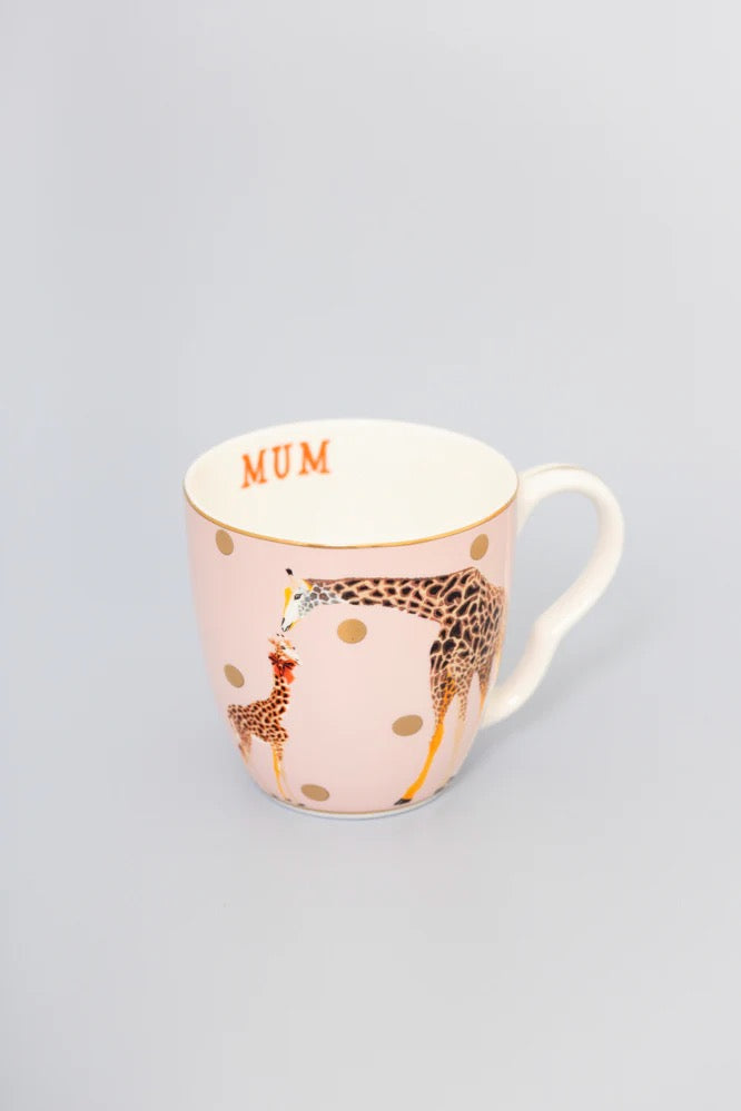 This mug is an ideal gift for birthday's, Christmas or mothers day, a great way to celebrate your lovely mum. This large mug has a pastel pink background, a gold rim and spots for extra elegance! Our favourite giraffe and her mini me, dressed with a red ribbon around their neck, adorn the sides of the mug and there's a hidden MUM slogan inside!